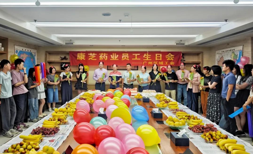 當日下午,廣州區域員工生日會在大會議室圓滿舉行。活動現場經過精心布置,五彩斑斕的氣球、精致的裝飾隨處可見,桌上精美的生日蛋糕、新鮮的水果,精心挑選的向日葵、甜蜜的巧克力,無一不在向康芝壽星們傳遞著美好祝福。